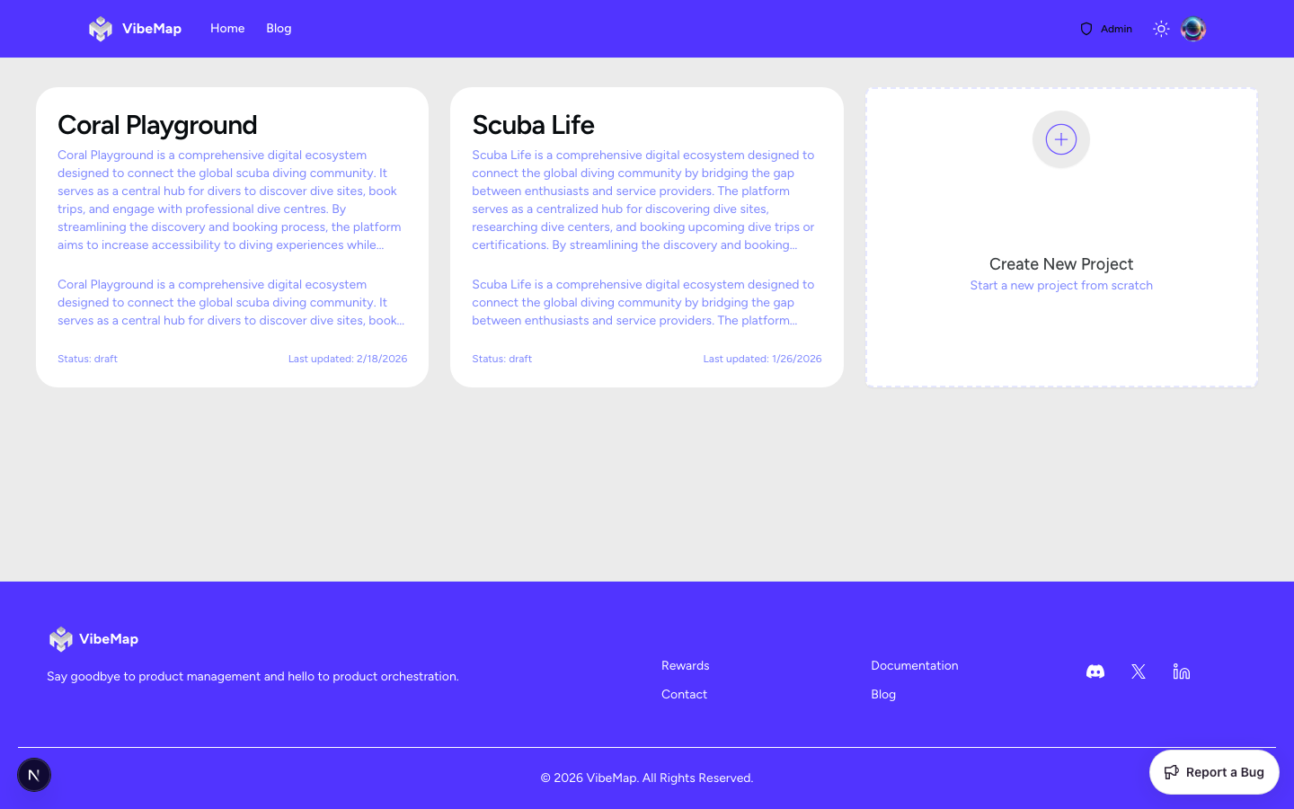 The journey starts on your dashboard, where you can manage all your active and past projects. This is where you'll initiate the AI-driven analysis that forms the core of Vibemap.
