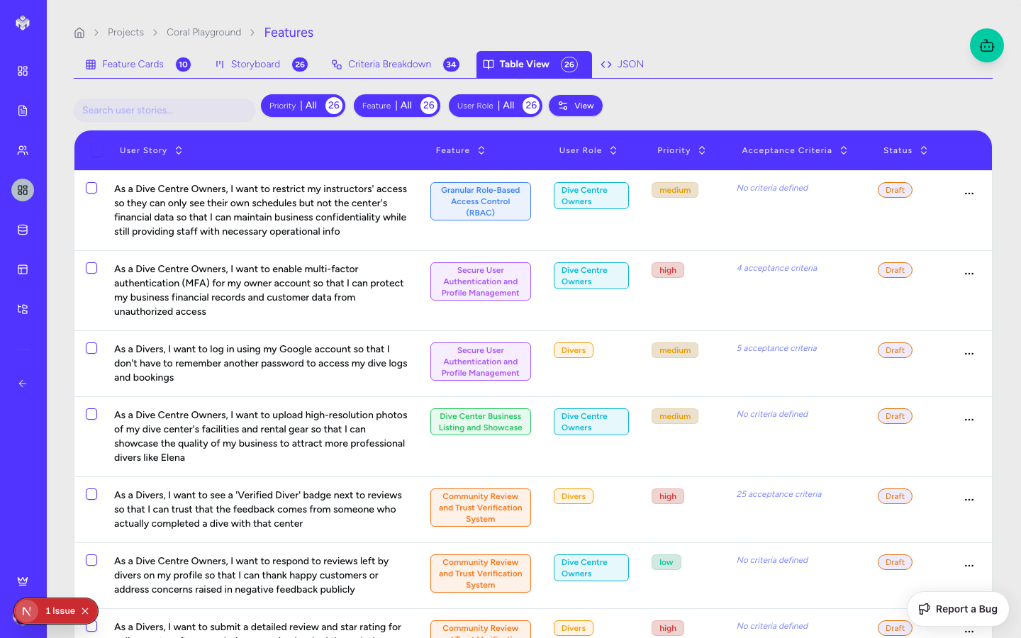 Filters: Quickly narrow down stories by associated persona, priority, or status.