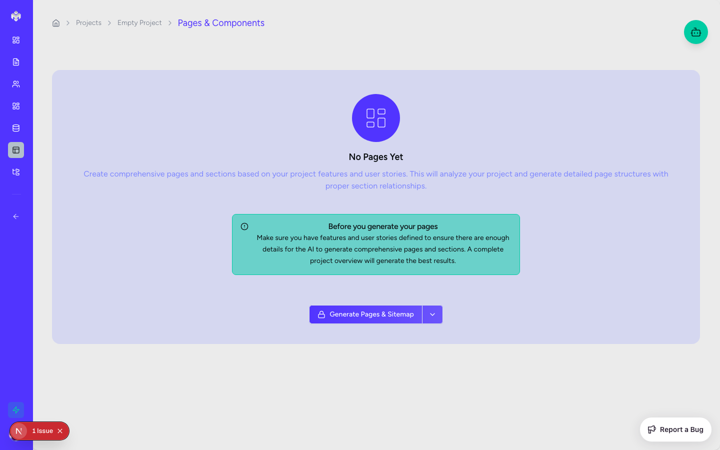 If no pages exist, you'll see a "Generate Pages & Components" button.